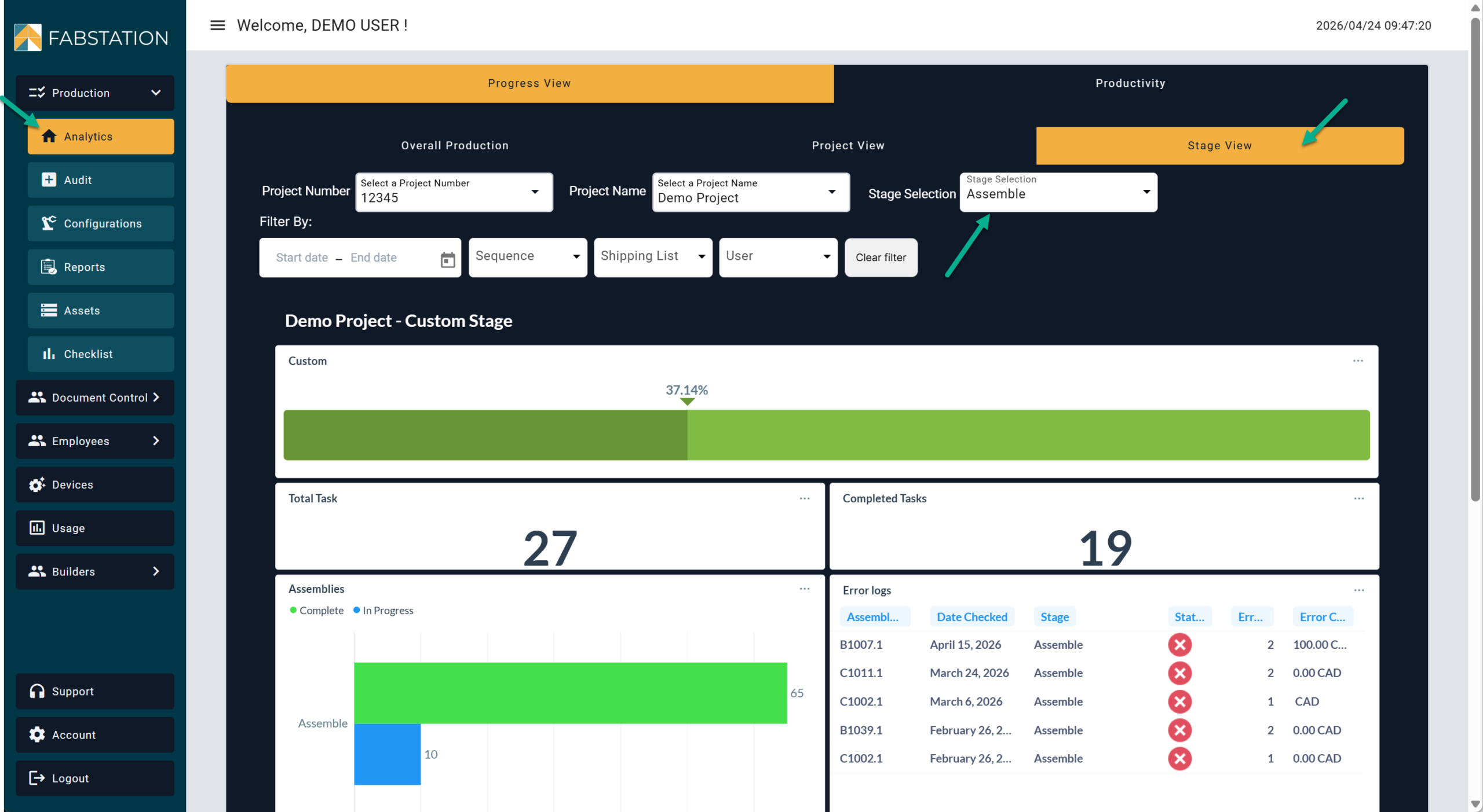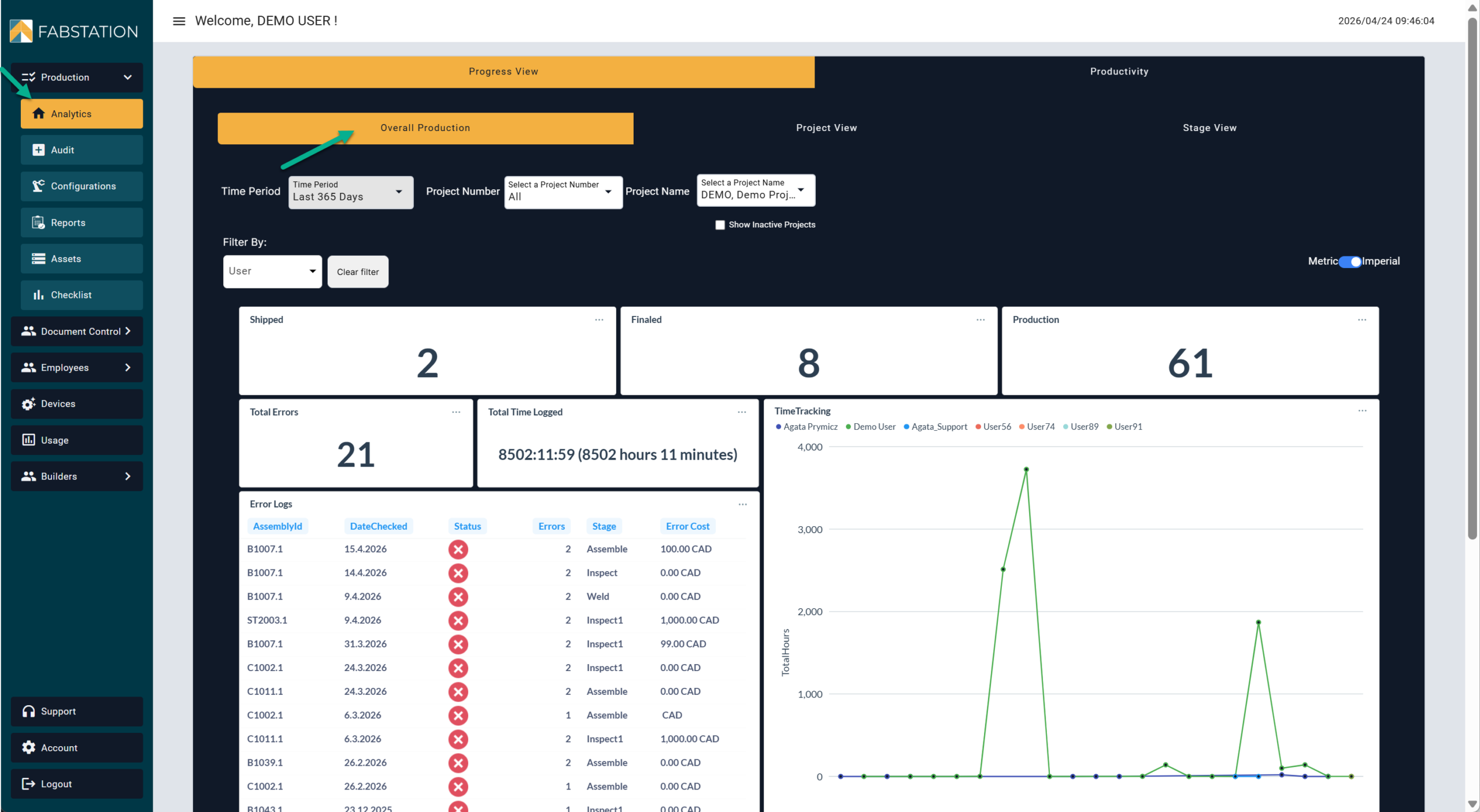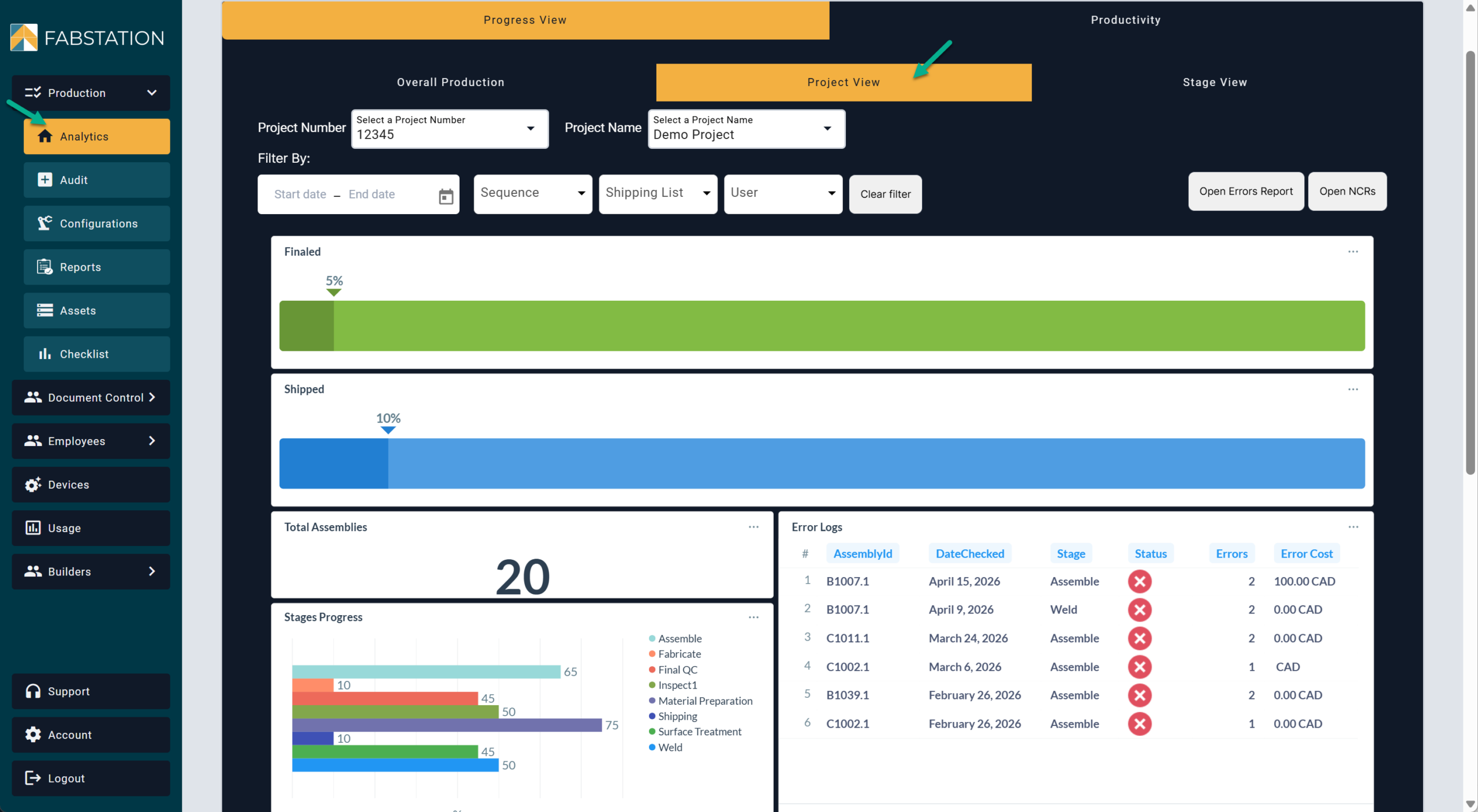 You can track both unresolved and resolved errors in the web portal. Go to Production>Analytics, from there FabStation offers three views:.
